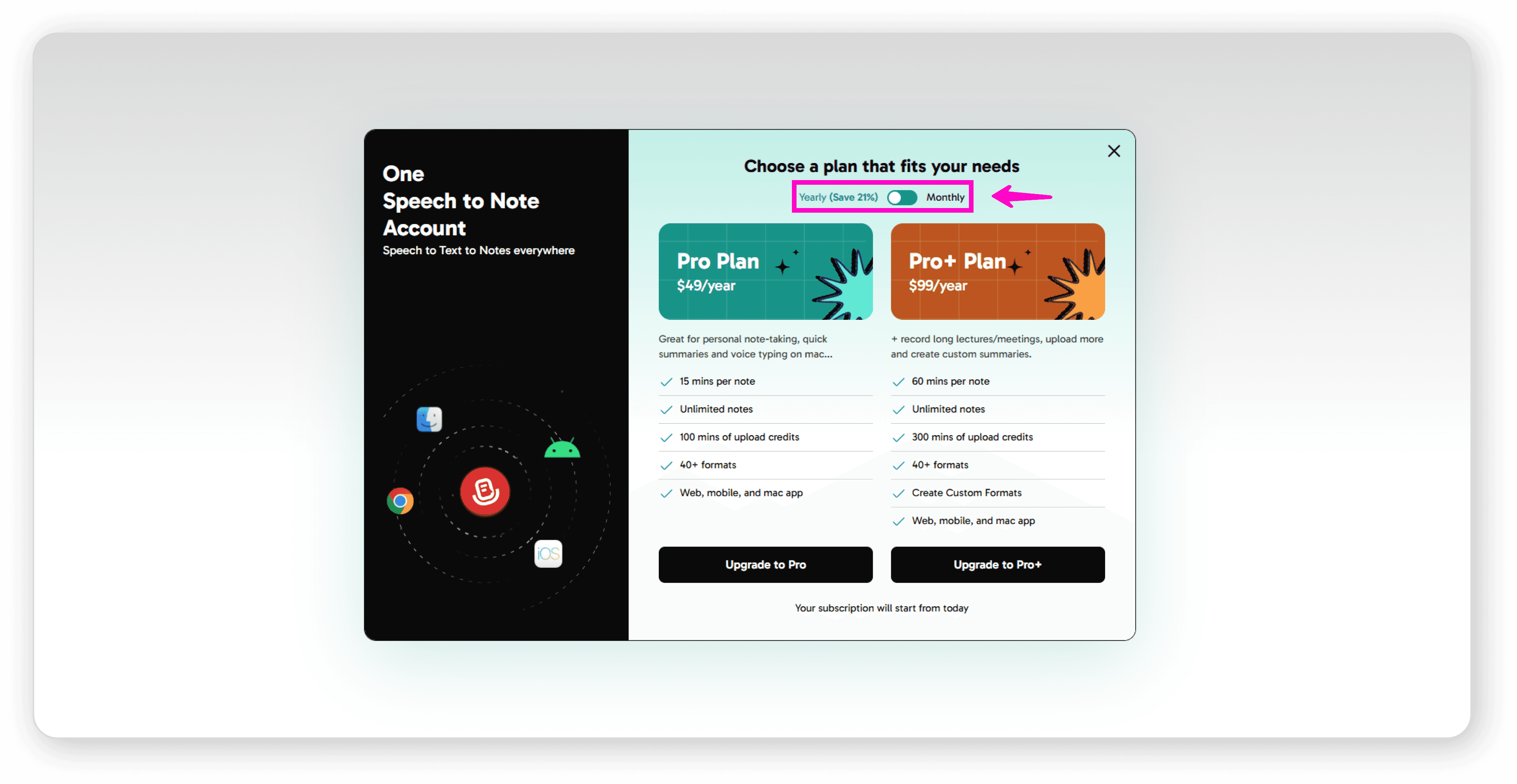 Use the toggle switch to choose between monthly and yearly billing