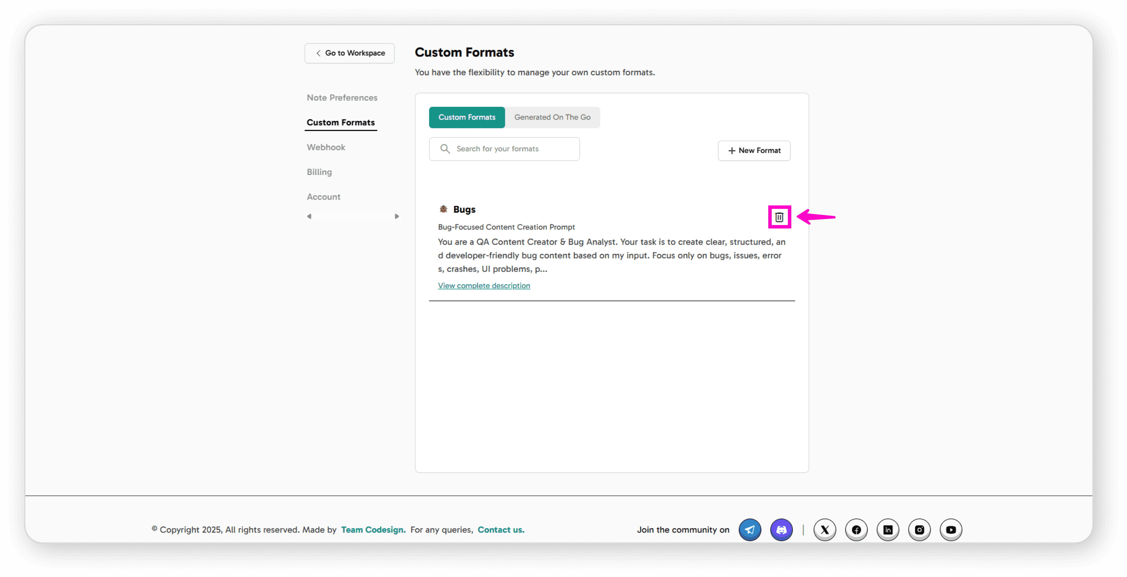 If you no longer need a custom format, simply click the delete icon next to it